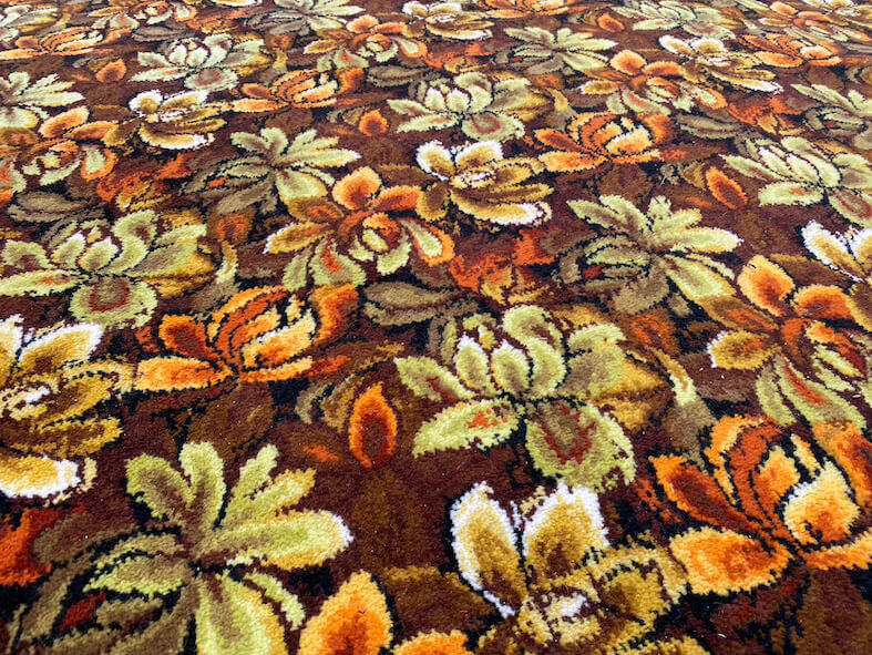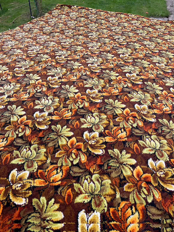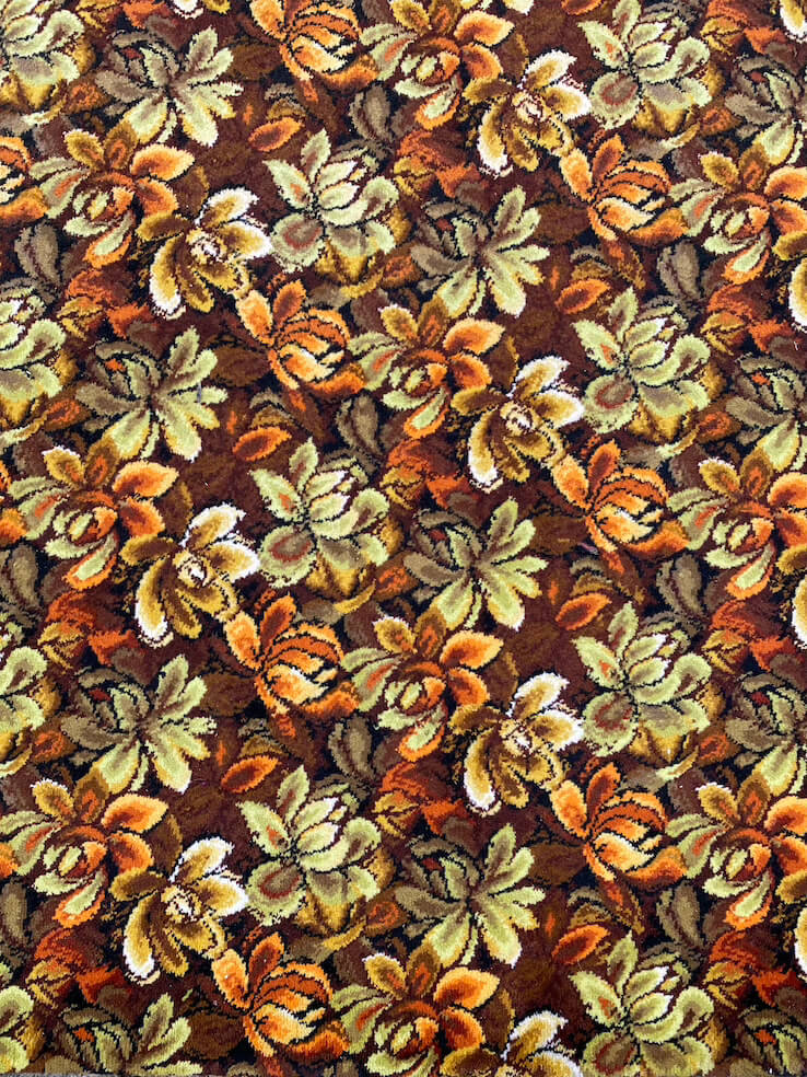 Autumnal Vibe and colours in this carpet . Very good quality – as usual ! Collected from a house in St Albans . This was the living room carpet in a house built in the late 1970s. The carpet is late 1970s and in very good condition – woven back . Colours are still very good . 430cm x 325cm.